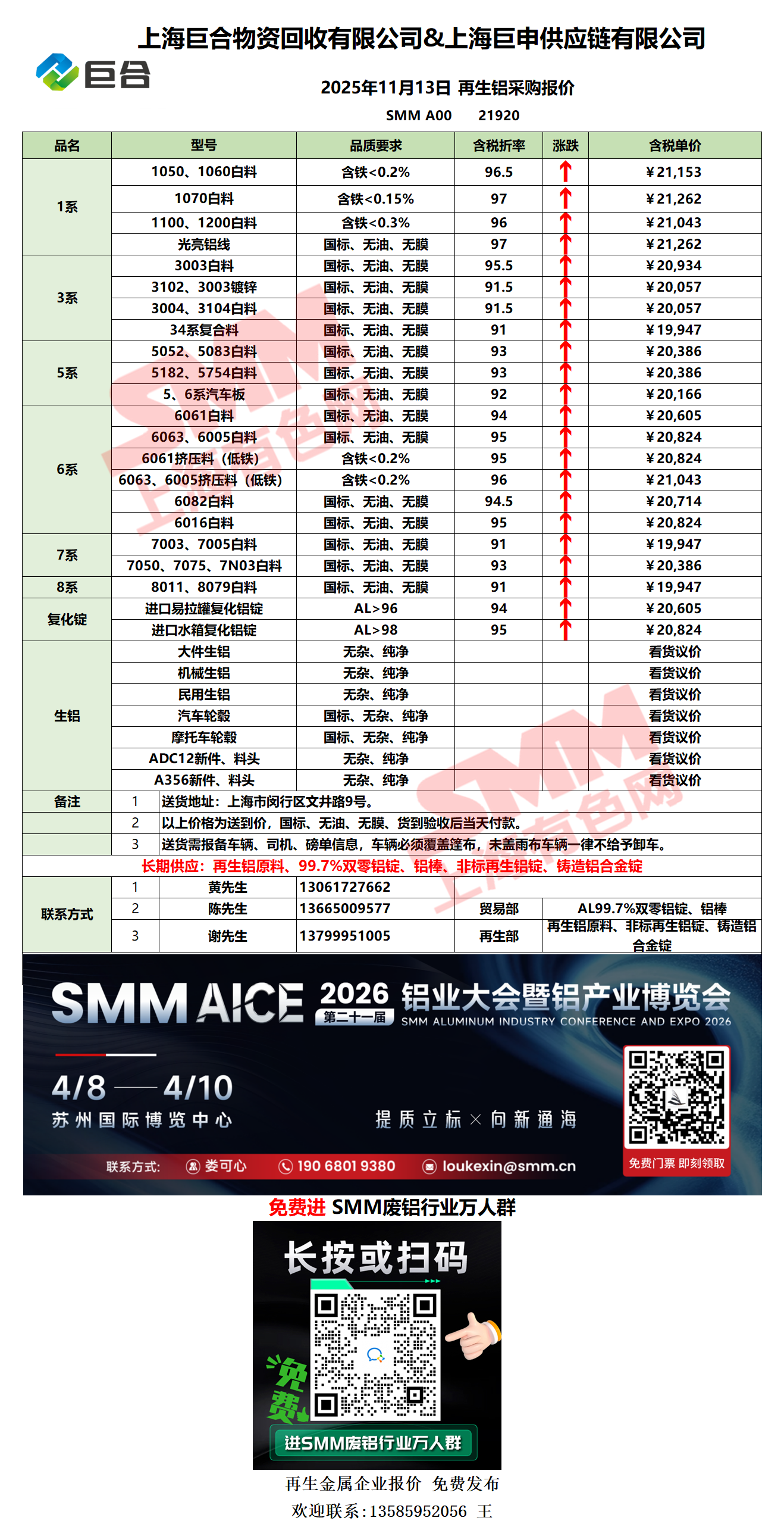 今日上海巨合 废铝采购报价已更新,有货的朋友欢迎联系我们!