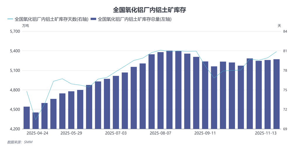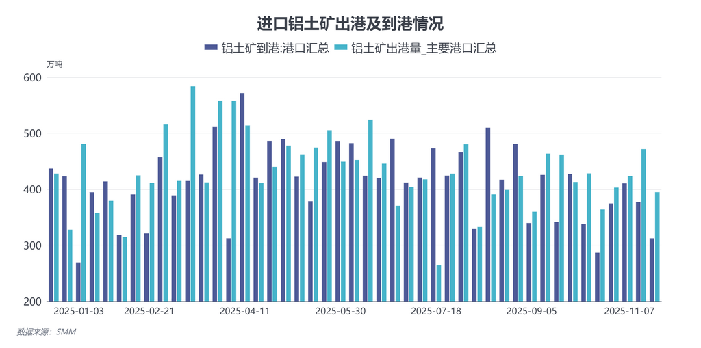 据11月7日数据显示,几内亚主要港口铝土矿周度出港总量为295.31万吨,较前一周减少59.81万吨,根据当前发运数据来看,几内亚雨季影响结束,铝土矿发运有望持续增加;澳大利亚主要港口铝土矿周度出港总量为91.95万吨,较前一减少15.34万吨。当前铝土矿到港稳步提升,截至11月7日,我国铝土矿到港量为312.32万吨,较前一周减少64.96万吨,据SMM调研,随着雨季结束后,几内亚矿区发运较前期有所增长,叠加前期被吊销矿权由政府接管的矿区,其港口月150万吨的库存正陆续发运,给予12月的铝土矿进口量一定支撑。