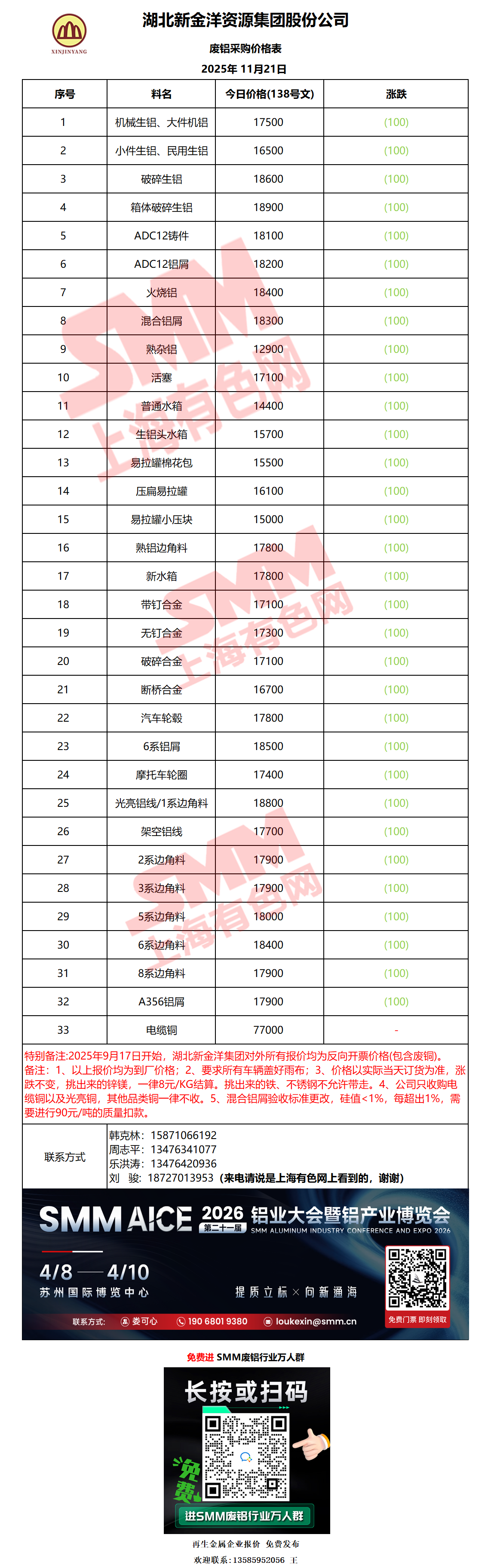 今日襄阳新金洋 废铝采购报价已更新,有货的朋友欢迎联系我们!