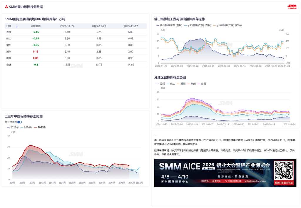 据SMM统计,11月24日国内主流消费地铝棒库存12.95万吨,较上周一库存下跌1.65万吨,较上周四库存下跌0.80万吨。