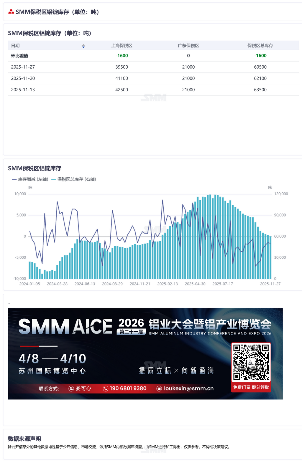 【SMM国内保税区电解铝库存统计】 11月27日,SMM统计上海保税区电解铝库存为39500吨,广东保税区库存21000吨,总计库存60500吨,库存较上周减少1600吨。