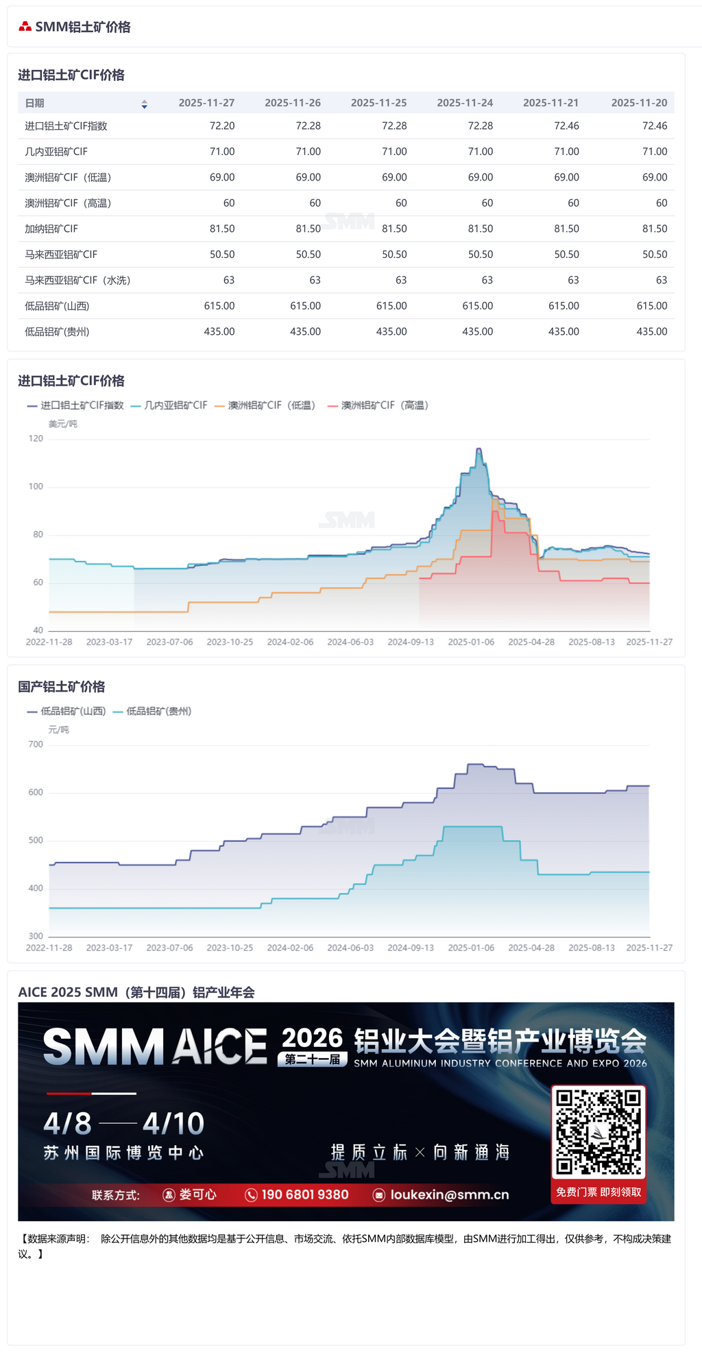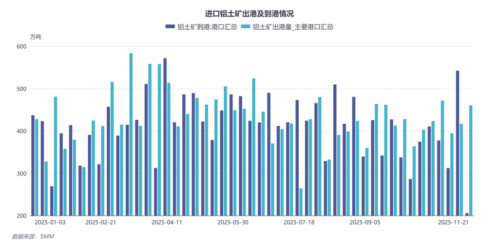 据11月21日数据显示,几内亚主要港口铝土矿周度出港总量为337.59万吨,较前一周增加17.49万吨,几内亚铝土矿发运稳定;澳大利亚主要港口铝土矿周度出港总量为122万吨,较前一减少37.58万吨。截至11月27日,我国铝土矿到港量为205.77万吨,较前一周减少336.54万吨。据SMM调研,广西地区部分待投氧化铝厂前期备货积极,部分港口反馈库存量大,已转移部分去周边港口,SMM将持续关注各港口的库存及到港变化。