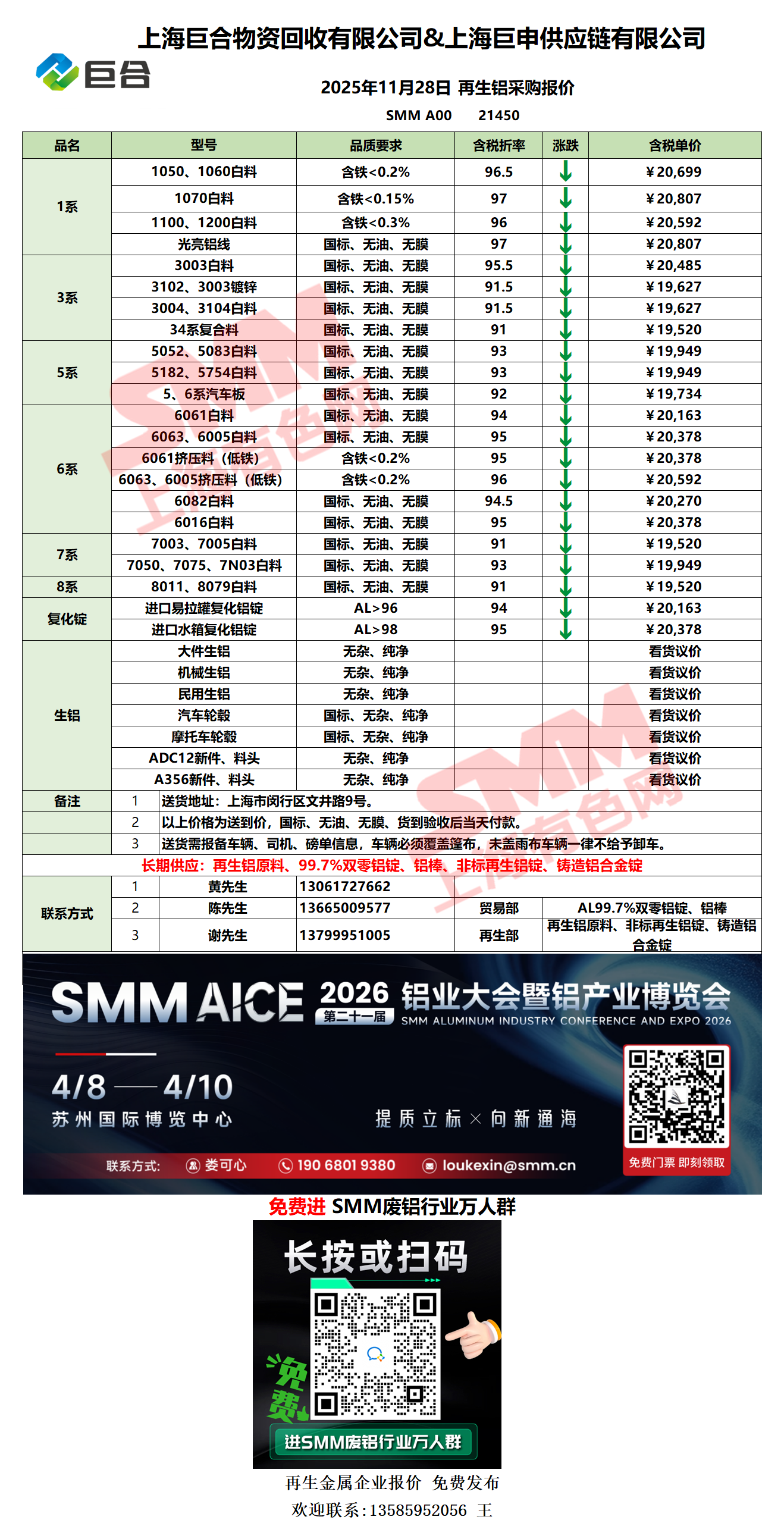 11月28日上海巨合 废铝采购报价