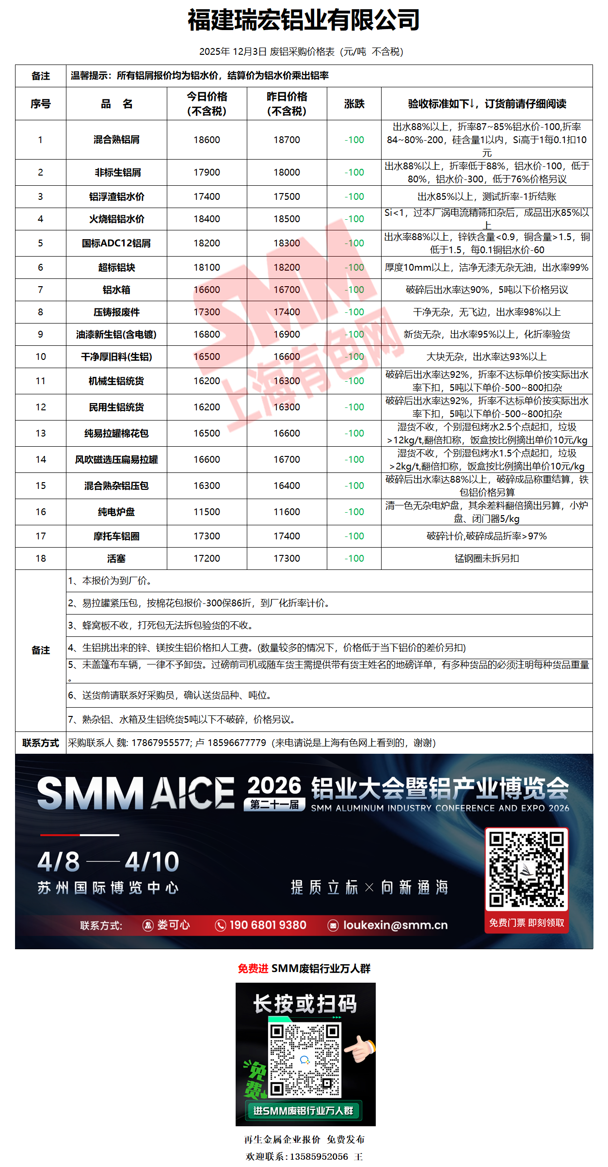 今日福建瑞宏 废铝采购报价已更新,有货的朋友欢迎联系我们!