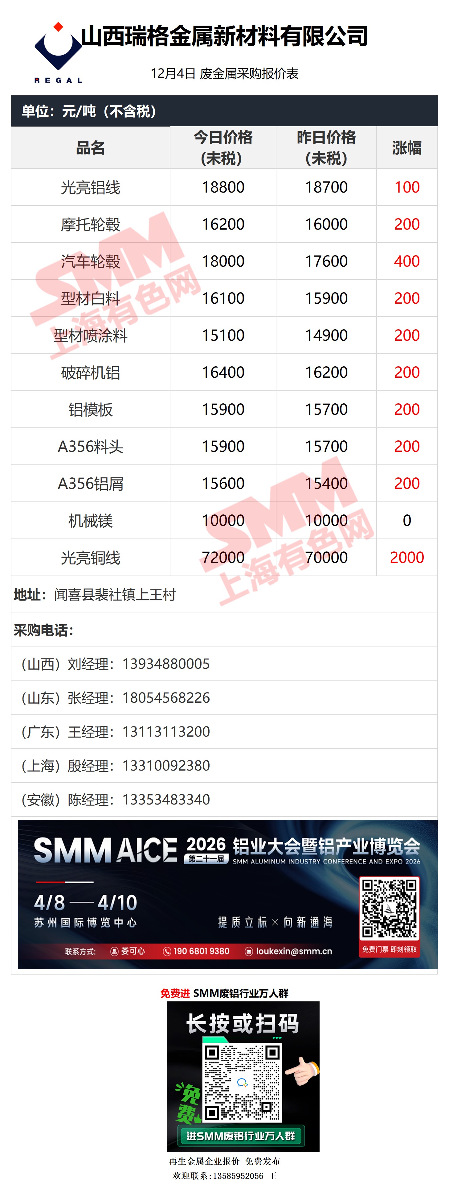 12月4日瑞格金属 废铝采购报价