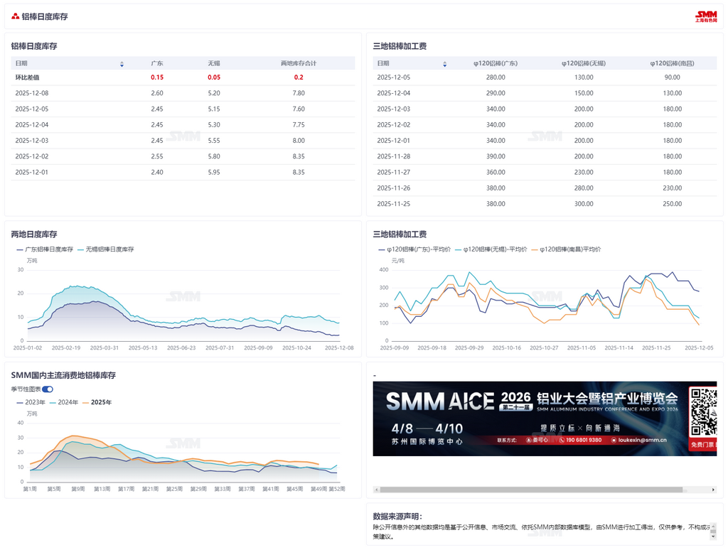【SMM国内两地铝棒日度库存】 2025年12月8日,据SMM统计,国内铝棒两地库存方面,广东铝棒库存2.60万吨,无锡铝棒库存5.20万吨,合计7.80万吨,较上期库存上涨0.2万吨