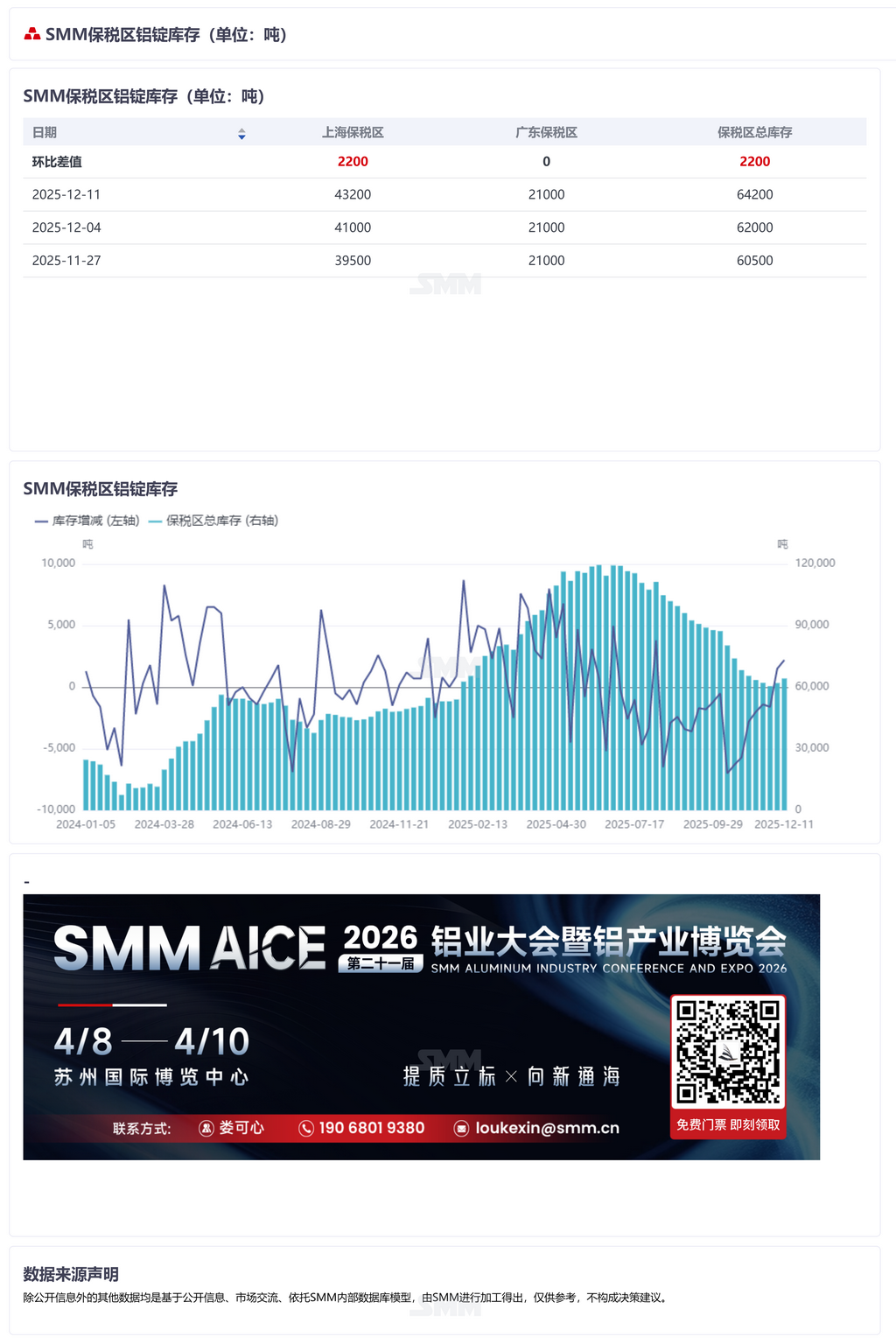 【SMM国内保税区电解铝库存统计】 12月11日,SMM统计上海保税区电解铝库存为43200吨,广东保税区库存21000吨,总计库存64200吨,库存较上周增加2200吨。
