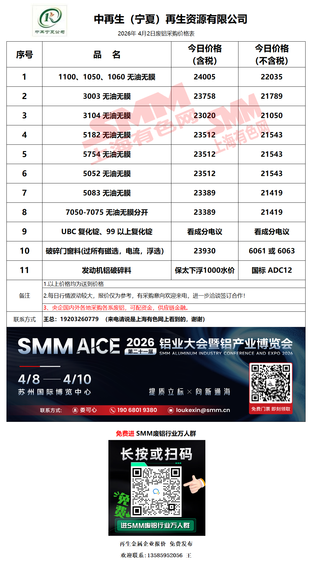 4月2日中再宁夏 废铝采购报价