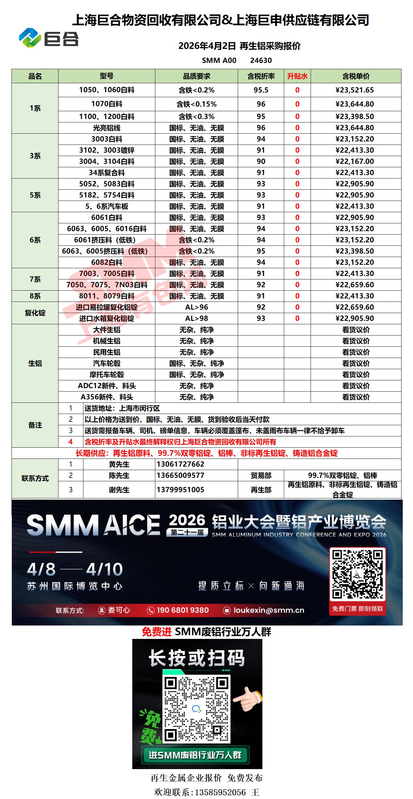 4月2日上海巨合 废铝采购报价