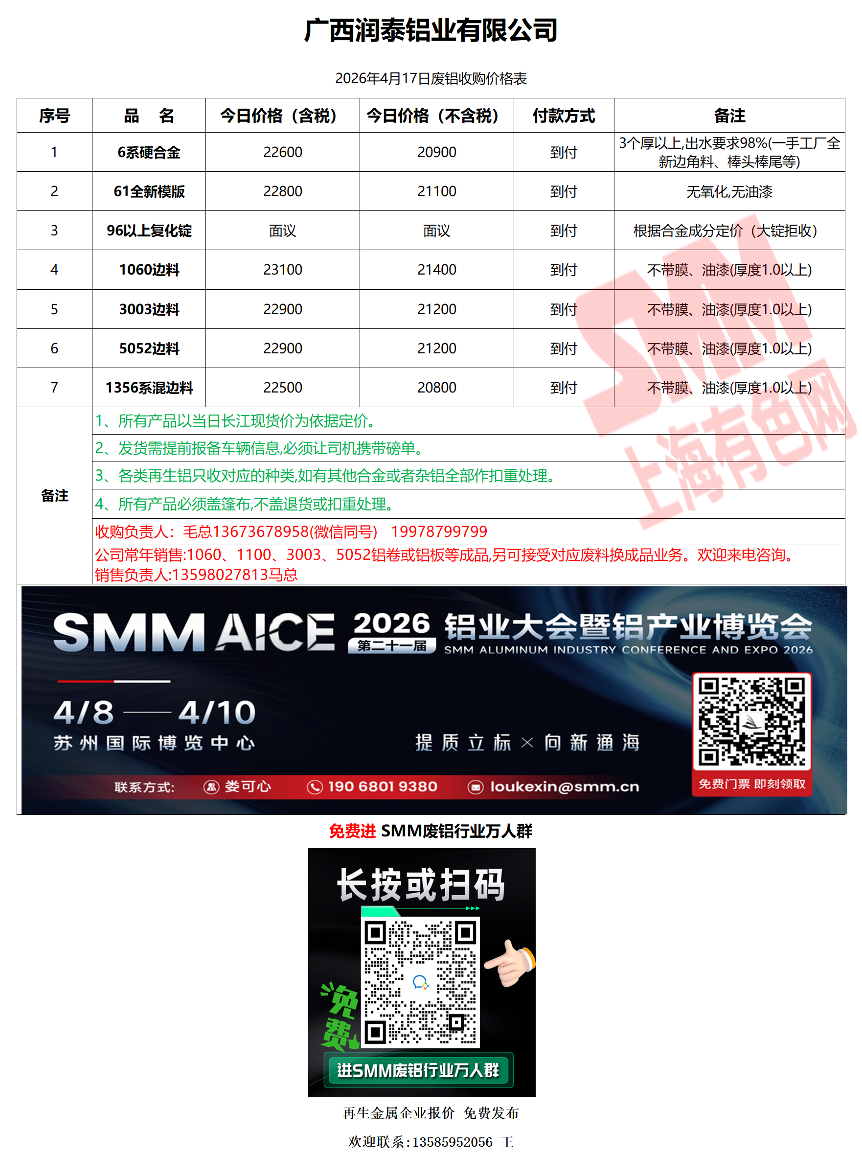 今日广西润泰铝业 废铝采购报价已更新,有货的朋友欢迎联系我们!