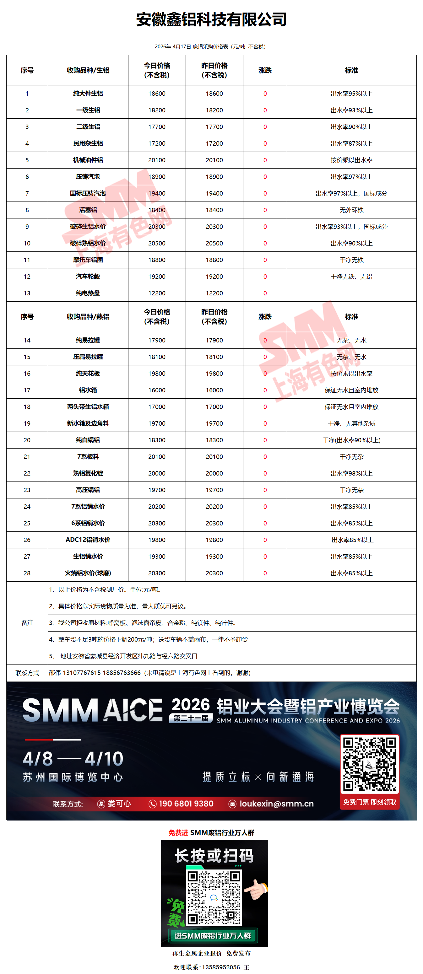 4月17日安徽鑫铝 废铝采购报价
