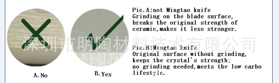2、加工工艺:以明陶科技公司自己开发的专用制刃设备磨制的刃口尖利并且巩固,仅有真实做到了耐久经用。