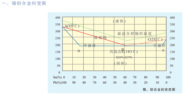 从图中能够看出,只要纯铅 (A点),纯锡(C点),易熔合金(共晶点B点)是在单一温度下熔化的。其他配比构成的合金则是在一个温度区域内熔化的,其上限(A—B—C线)称做液相线,下限(A-D-B-E-C线)称做固相线。在两个温度线之间为半液体区,焊料呈稠糊状。在B点合金不呈半液体状态,可由固体直接变成液体,这个B点称为共晶点。按共晶点的配比制造的合金称为共晶合金。