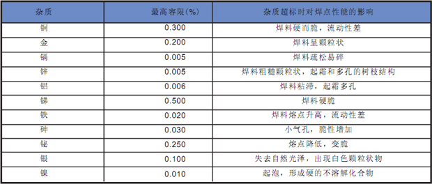 焊猜中除锡、铅外往往含有少数其他元素,如铜、锑、铋等。别的,在焊接作业中,PCB和元件脚上的杂质也会带入锡炉内。这些元素对焊锡的功能会有影响,下表列出的为我国电子职业标准SJ/TIOI34一94中杂质答应规模及对焊点功能的影响。