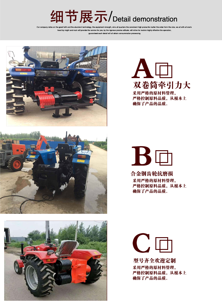 机动牵引机由滚筒轮、变速箱、柴油机或汽油机和底座结构组成,机动牵引作业原理:牵引槽是用来直接和钢丝绳衔接的牵引槽,以汽油机或柴油机、电动机作为动力,通过变速箱的变速来打到要求的转速,整机坐落于钢结构上,安定且移动便利。