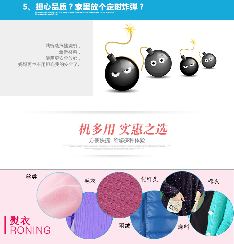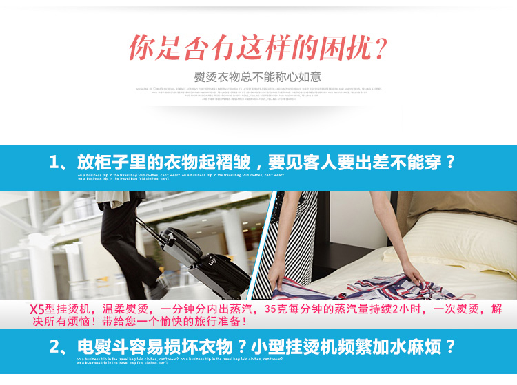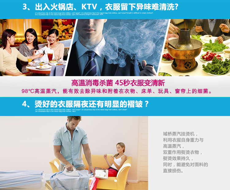 挂烫机适用于任何质地的衣服、窗布、毯子及毛绒玩具、沙发、厨房除垢的熨烫和消毒除尘,因为挂烫机设备便利、运用简略、操作轻松,特别适合于服装专卖店、普通家庭、宾馆和酒店运用。