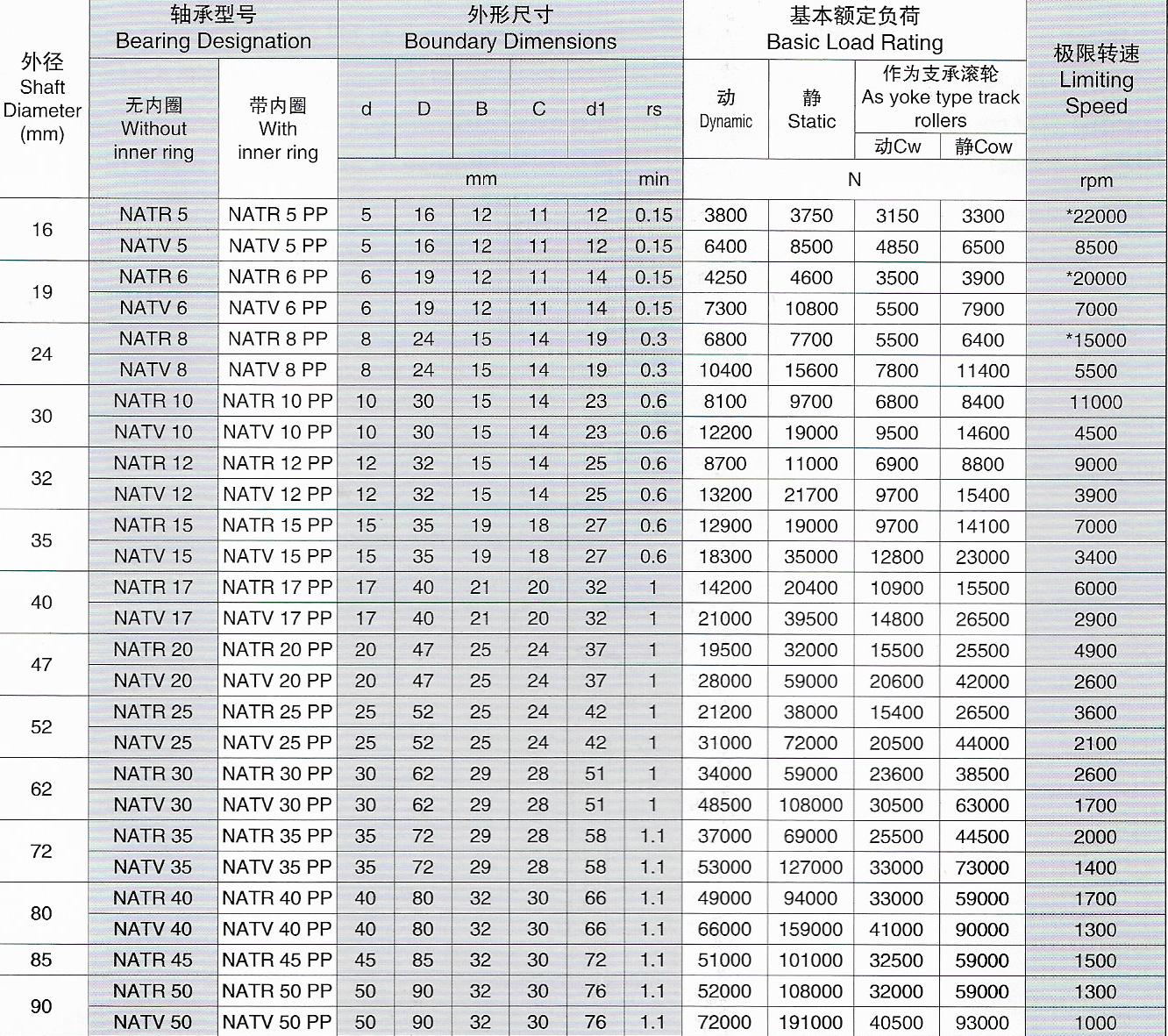 NATR12支承滚轮的外圈壁厚,使用这种外圈,滚轮可以直接在滚道上翻滚,可以接受十分重的载荷。支承滚轮有压力滚轮、偏疼滚轮、摇杆滚轮。滚轮的外径为圆柱形或球形。使用球形外圈可以使装置时歪斜方位得到补偿。因为翻滚体的轴向引导,甚至在高速下也可接受冲击性的轴向载荷,广泛应用于矿山,运送,冶金,起重机械等职业。