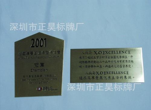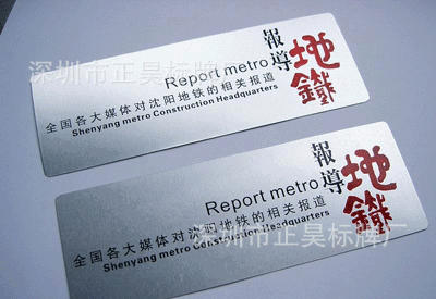 金属腐蚀铭牌:可用铝.铝合金.不锈钢.铜来制造.可腐蚀字和专业腐蚀底色.做出来的作用可分字凸起来,和字凹下去的两种.中间可穿多孔.只需我公司有通用的孔.出产时不必收五金模具费。铝板冲压标牌:铝板冲压有分:铝板丝印后冲压,和铝板氧化后冲压,还有铝板冲压后喷漆,铝板冲压后涂漆,冲压后的标牌上的字体都可做高光加工,冲压标牌的特点是底材比较簿,能够做到0.3-0.8MM左右,相对油压标牌来讲,报价会更廉价一点.还有要什么颜色能够印什么颜色上去,印好后再把字体冲凸.腐蚀:首要要根据产品图画制造好菲林片,再将菲林片上图画印刷在材料上,再放入调制好的药水进行腐蚀图画。字体颜色的处理方法:⑴丝印:产品字体高光后,要在凸起的字体上做不同的颜色,可采用丝印的方法达到,同一平面上的字体可丝印多种颜色,有必要每丝印完一种颜色后经烤箱烤干后方可再丝印其他颜色.⑵电镀:标牌字体高光后可根据客户要求电镀不同的颜色(如:黑色、金色、赤色、镀铬)⑶涂漆:涂漆有必要有边挡住,油漆才不会处流,那就要求有边框,或许涂漆处是下凹的。