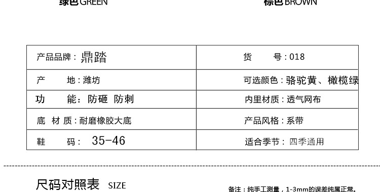 关于尺码我是国标正码,请各位亲定心购买,劳保鞋由于前面带钢包头一般比运动鞋大**和皮鞋码数根本共同也就是说运动鞋穿41劳保鞋40是正好的皮鞋穿41劳保鞋主张买41即可常常穿劳保鞋的按平常穿劳保鞋的码数挑选就行。