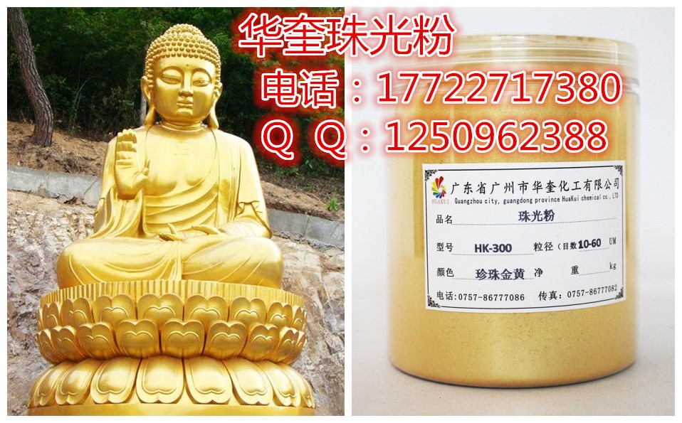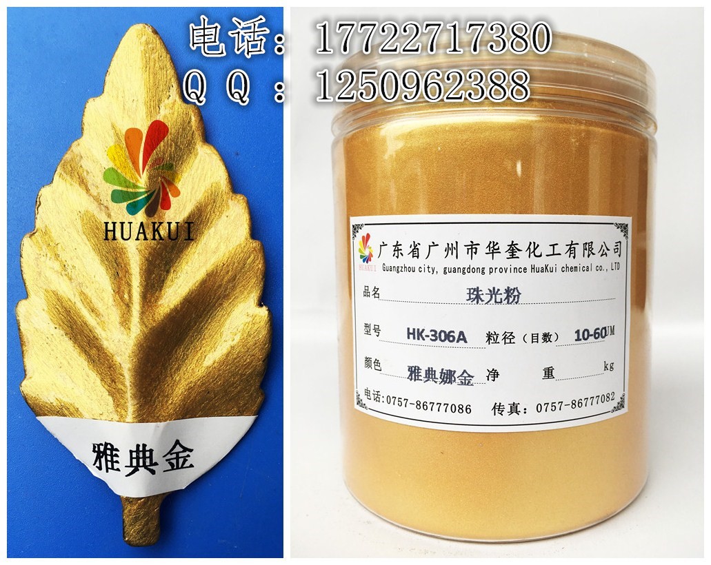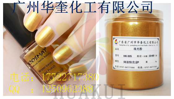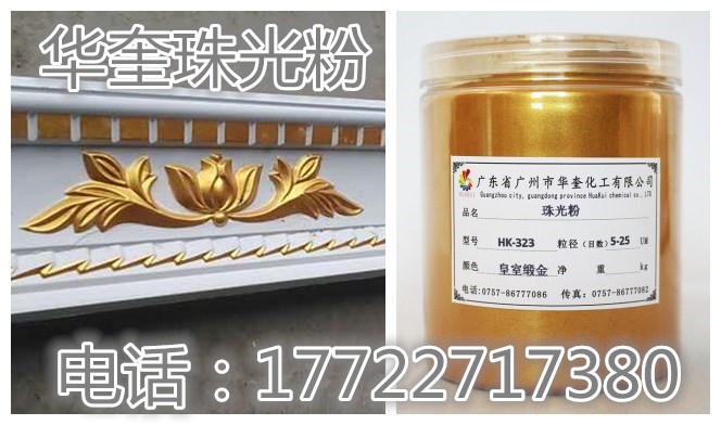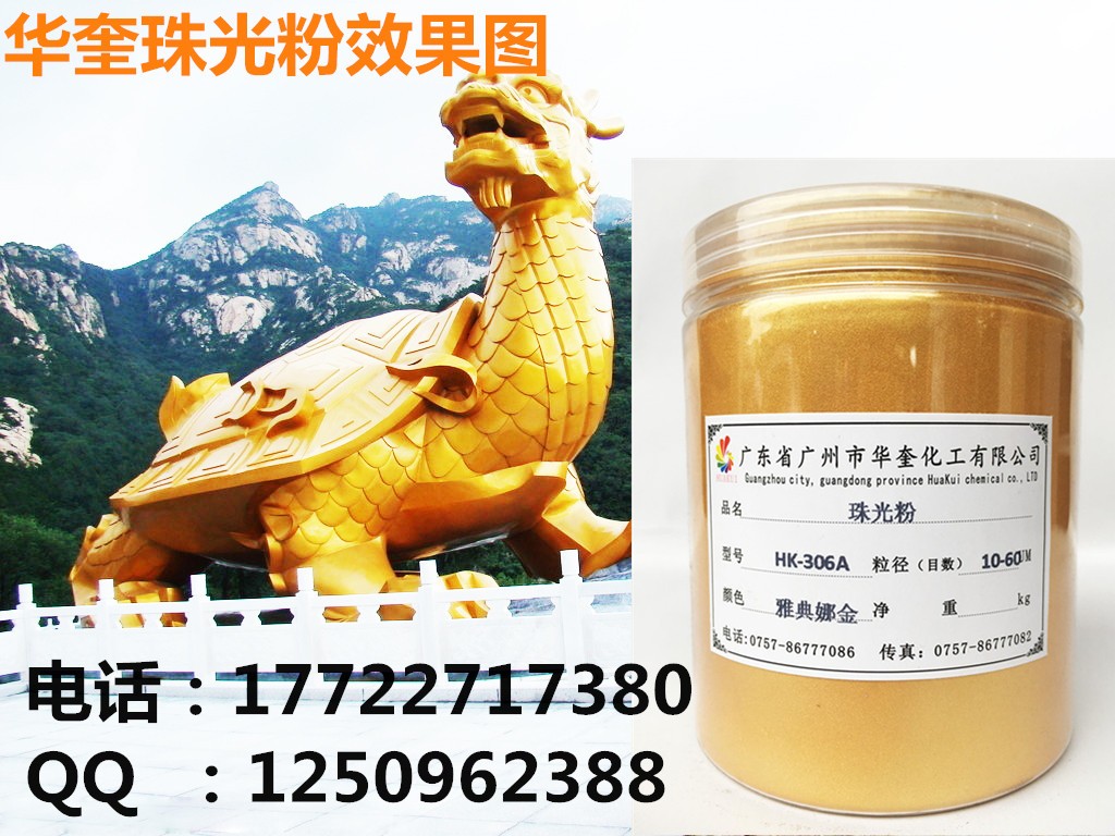 广州华奎公司17722717380专业研发\开发\出产\供应各种珠光作用颜料和珠光粉的厂商。产品 能够广泛应用于轿车、摩托车、自行车涂料、粉末涂料、建筑涂料、珠光油墨、珠光皮革、珠光轿车,摩托车,自行车,油漆涂料,印刷油墨,化妆品,家具,美术字体,塑胶,陶瓷,皮革,(人造革),工艺品,纺织品,佛具,纸业,香业,玩具,装饰品等各种高级产品上色喷涂。(娱乐场所,洒店,宾馆,别墅比及装饰)和水性及溶剂性的产品等职业的不同需求,赋予这些职业的产品以诱人的外观及高雅的光泽。产品有雪白系列、虹彩系列、金色系列、上色系列、云母铁系列、超白和水晶系列