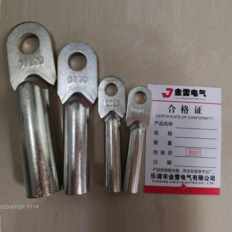 型号1:DT,是由T2铜棒做成, 产品外貌为锅铲圆头,可用于密封堵油,顶端这边为固定上螺丝用,末端剥皮后的电缆用端子钳压紧即可。