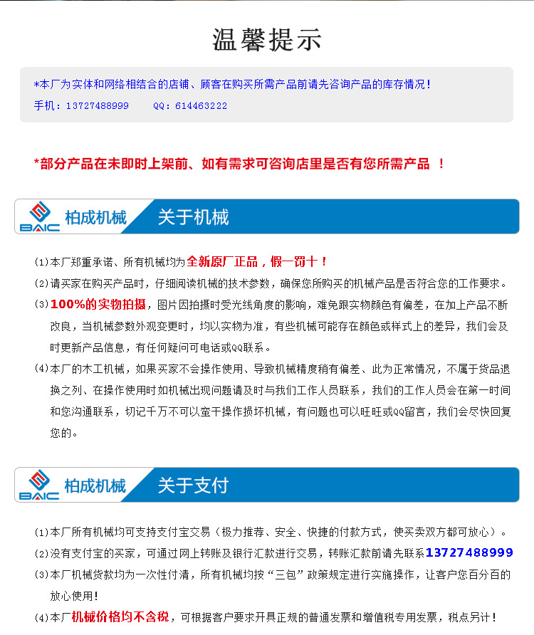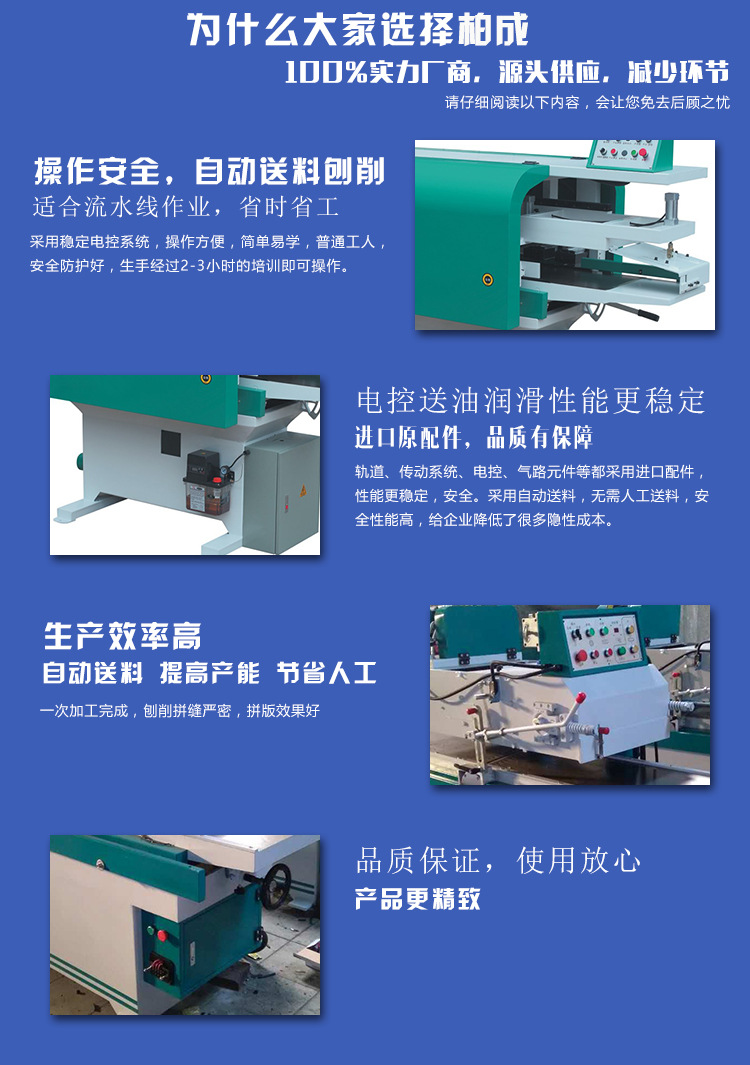 产品有带锯机系列、排钻系列、封边机系列,冷、热压机、推台锯、铣床等,柏成是一家**独资厂商,公司总部设在顺德区伦教羊额工业区,柏成机械具有完好、科学的质量管理体系。柏成木匠机械的诚信、实力和产质量量取得业界的认可。欢迎各界朋友莅临柏成木匠机械观赏、辅导和事务洽谈。