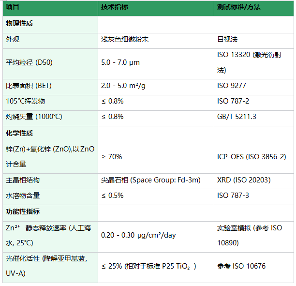 产品描述: T2570是一种通过特殊固相烧结工艺合成的锌基尖晶石固溶体功能材料。其独特的晶体结构有效调控了锌离子的释放行为,并显著降低了光催化活性。本品主要设计用于高端海洋防污涂料及工业防腐涂料体系,在提供长效、环保防污功能的同时,能有效改善漆膜的机械性能与耐久性。