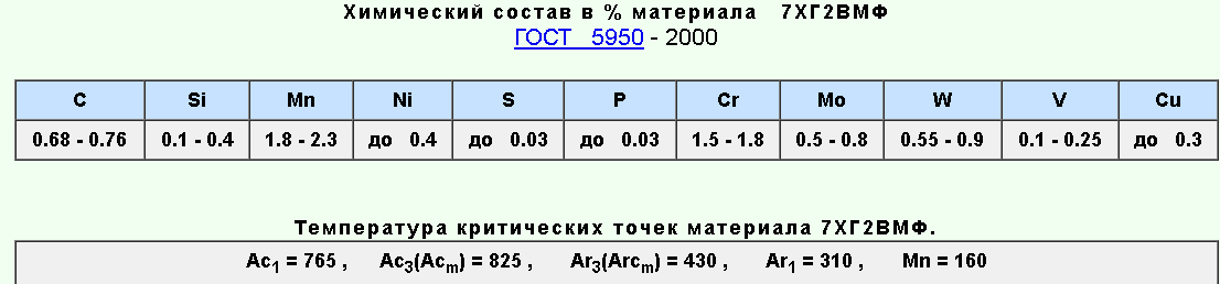 Р6М5Ф3, Р6М5К5, 7ХГ2ВМФ, 4Х3ВМФ, 6ХВ2С, 5ХВ2СФ, 4Х5МФ1С, ЭП572, 4Х5В2ФС, ЭИ958, Х12ВМФ, Х12МФ, Х12Ф1, 4Х4ВМФС, ДИ22, 8Х3, 5Х2МНФ, ДИ32,