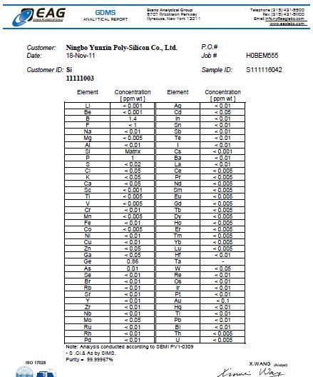 宁波市运鑫多晶硅有限公司选用冶金法出产的5 N太阳能级多晶硅,其间磷含量小于1ppm,硼含量为2ppm。能与6N、7N掺杂,掺杂比率高达30%~50%,是抱负的太阳能电池掺料。