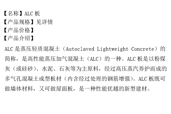 ALC板施工速度快,装置便利,适合用作多层、高层建筑内隔墙板、外墙板、屋面板和小跨度的楼板。ALC板在欧洲、日本运用很广,在我国是刚起步,它是国家建材局要点推行的新式建筑材料。