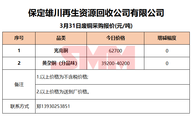 3月31日保定雄川 废铜采购报价
