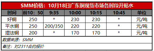 10月18日广东铜现货市场各时段升贴水(第三时段10:15)【SMM价格】