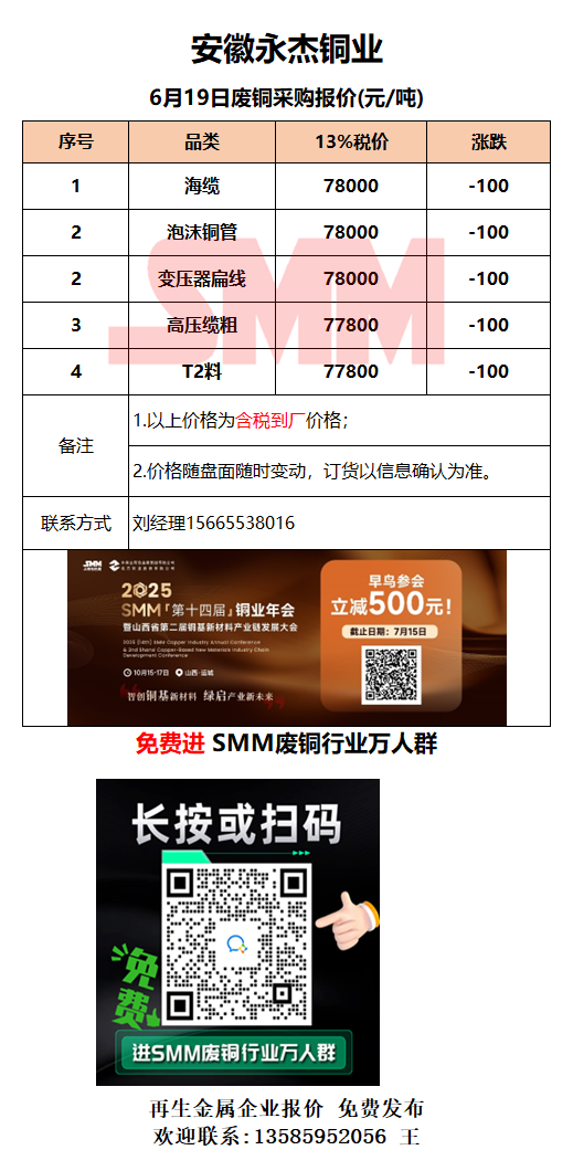 今日安徽永杰 废铜采购报价已更新,有货的朋友欢迎联系我们!
