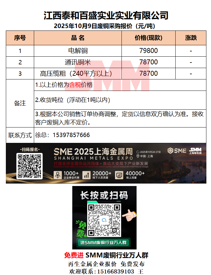 10月9日同升金属 废铜采购报价