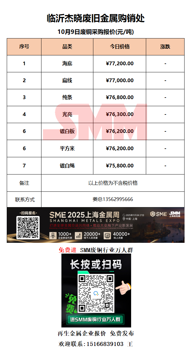 10月9日同升金属 废铜采购报价