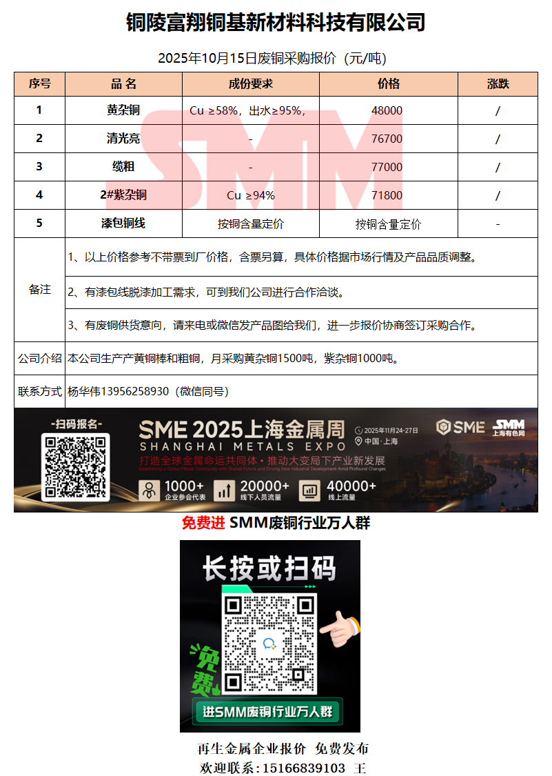 今日铜陵富翔 废铜采购报价已更新,有货的朋友欢迎联系我们!
