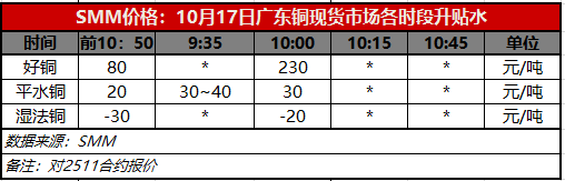 10月17日广东铜现货市场各时段升贴水(第二时段10:00)【SMM价格】