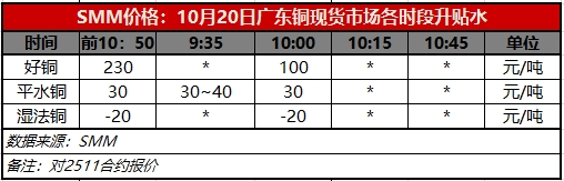10月20日广东铜现货市场各时段升贴水(第二时段10:00)【SMM价格】