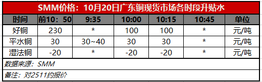 10月20日广东铜现货市场各时段升贴水(第四时段10:50)【SMM价格】