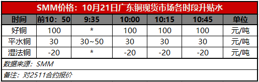 10月21日广东铜现货市场各时段升贴水(第三时段10:15)【SMM价格】