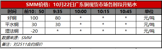 10月22日广东铜现货市场各时段升贴水(第二时段10:00)【SMM价格】