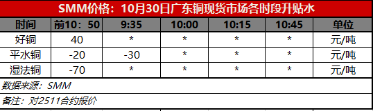 10月30日广东铜现货市场各时段升贴水(第二时段10:00)【SMM价格】