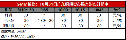 今日广东1#电解铜现货对当月合约贴水30元/吨-升水30元/吨,均价升水0元/吨持平上一交易日;湿法铜报贴水100元/吨-贴水60元/吨,均价贴水80元/吨持平上一交易日。广东1#电解铜均价87510元/吨较上一交易日跌605元/吨,湿法铜均价为87430元/吨较上一交易日跌605元/吨。