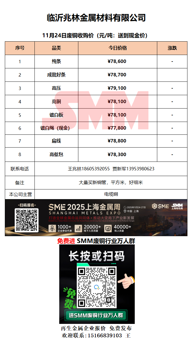 11月24日临沂兆林金属 废铜采购报价