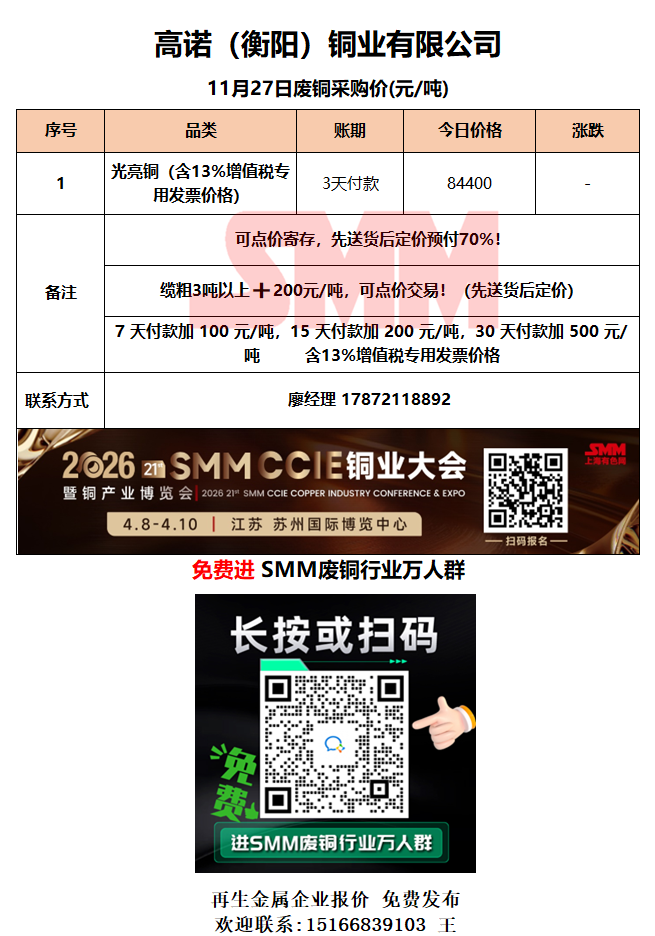 11月27日高诺(衡阳)铜业 废铜采购报价