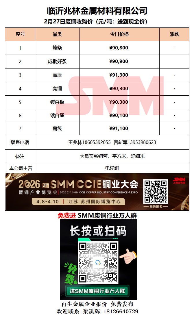 2月27日临沂兆林金属 废铜采购报价