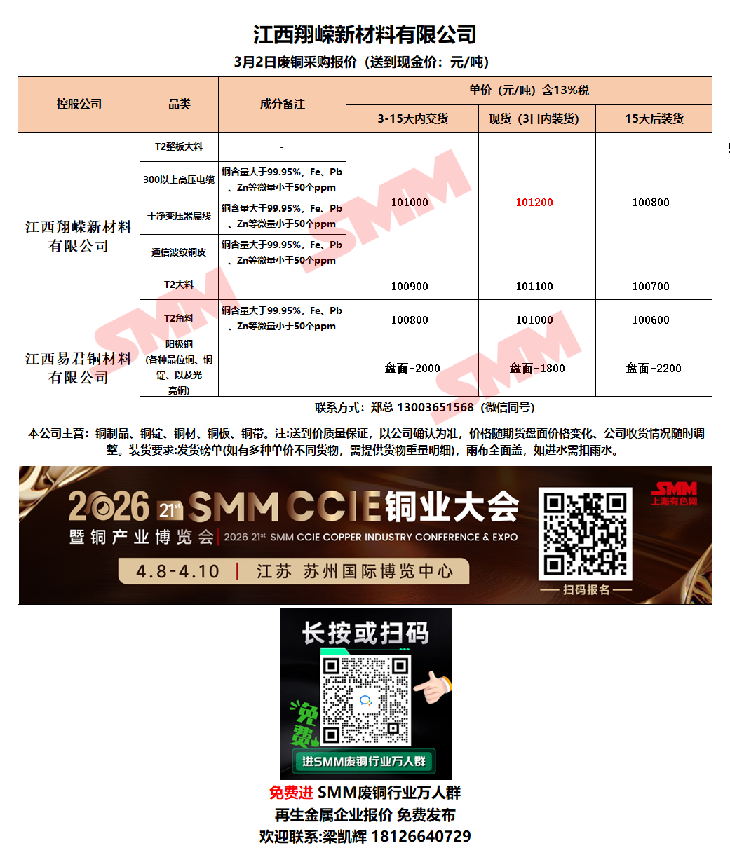 3月2日江西翔嵘新材料 废铜采购报价