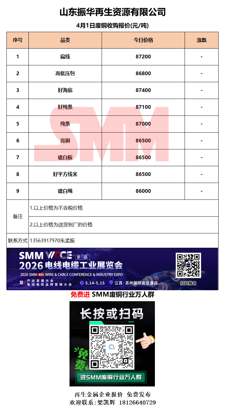 4月1日山东振华 废铜采购报价