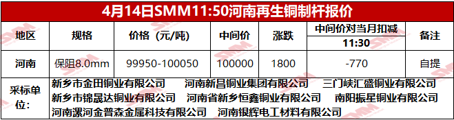 4月14日SMM河南地区再生铜制杆报价