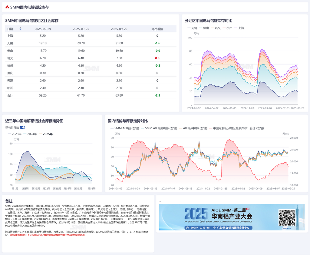 2025年9月29日电解铝锭:周一库存59.20万吨【SMM数据】